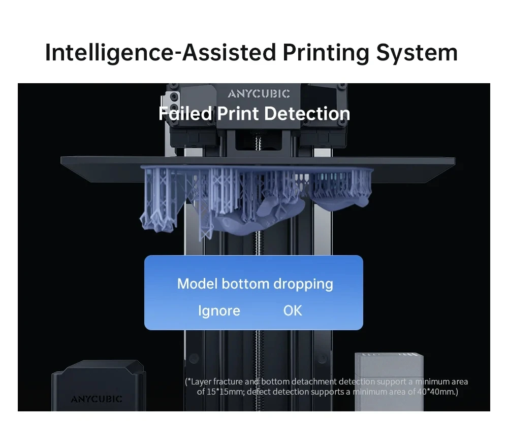 During the printing process, if the model experiences issues such as layer fractures, bottom detachment, or detachment, printing automatically stops and a pop-up alert is issued, allowing users to adjust the printing task promptly, avoiding wasted resin and time.