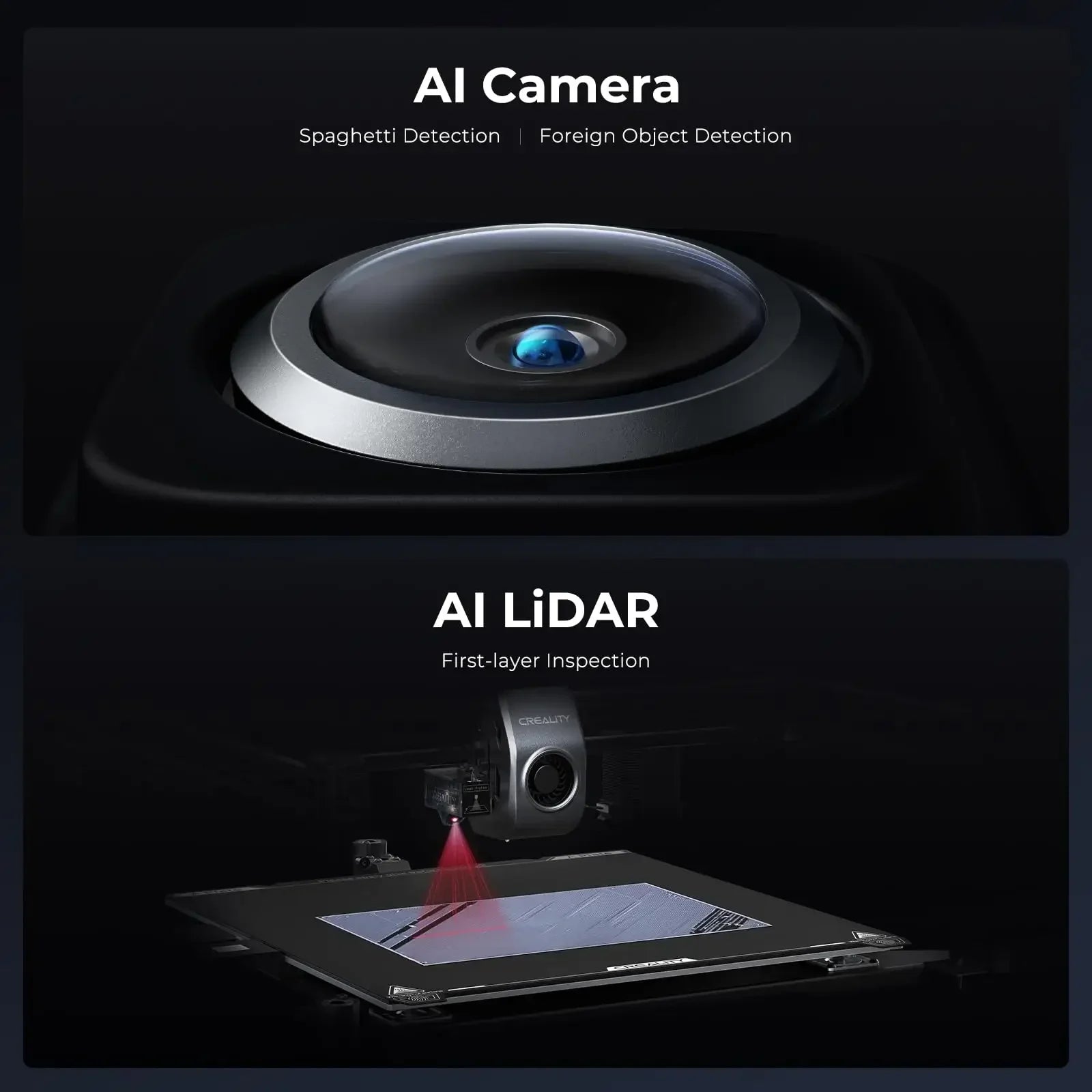 K1 Max uses an AI camera to watch over spaghetti failure, foreign objects, debris, etc. It will alert you when an error occurs. It also supports real-time monitoring and creates time-lapses for sharing.