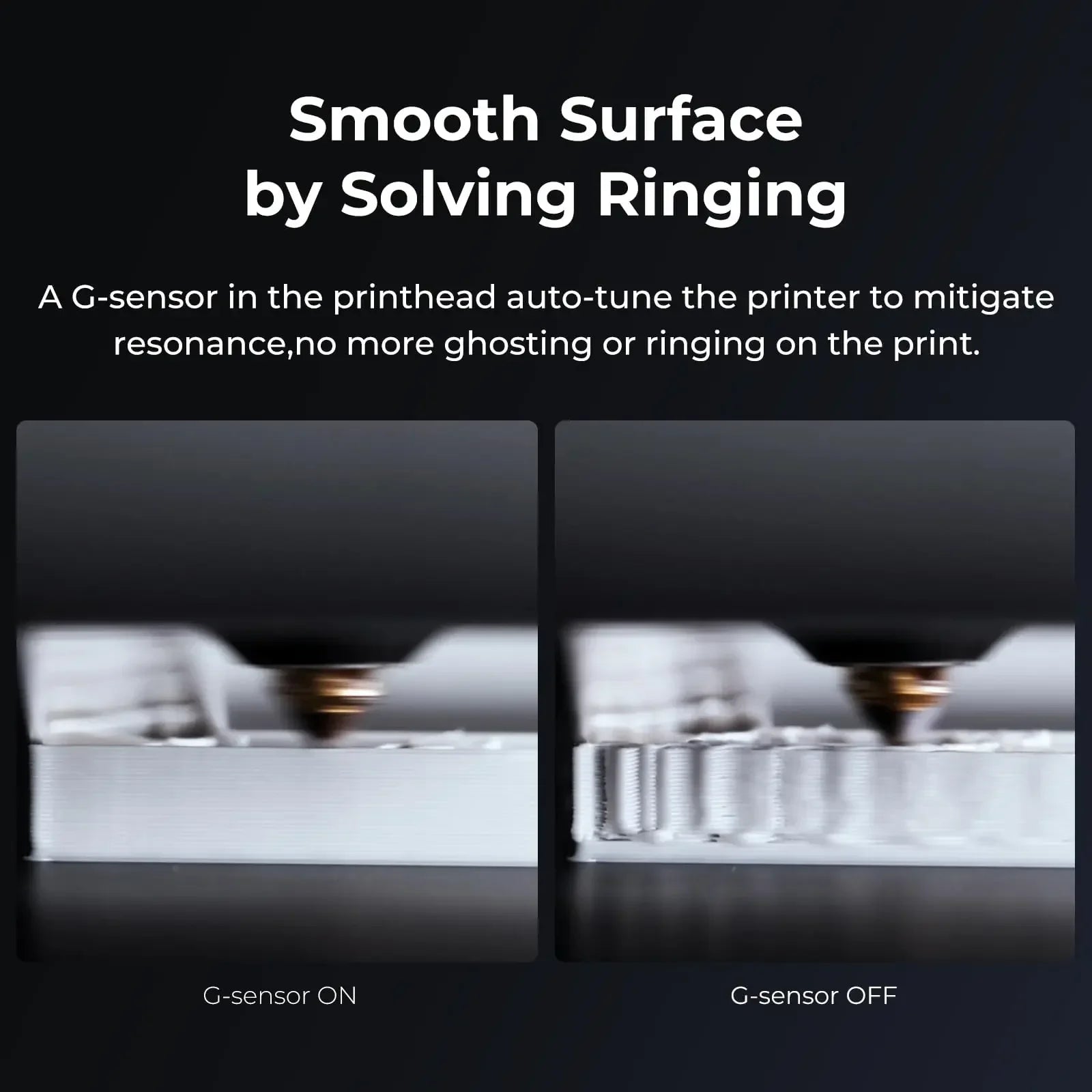 A G-sensor in the printhead measures the resonance frequencies of high-speed printing, and auto-tune the printer to mitigate it. No more ghosting or ringing on the print.