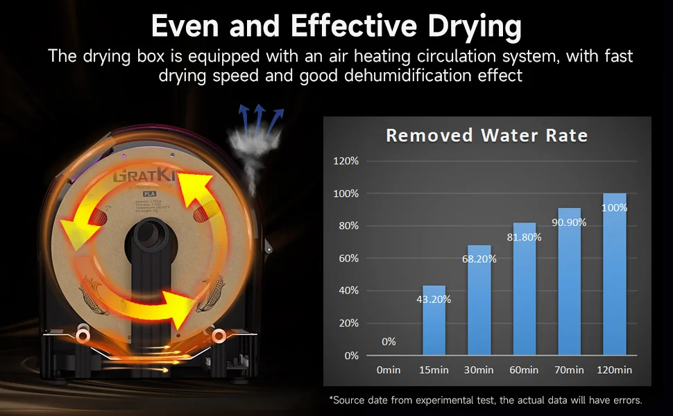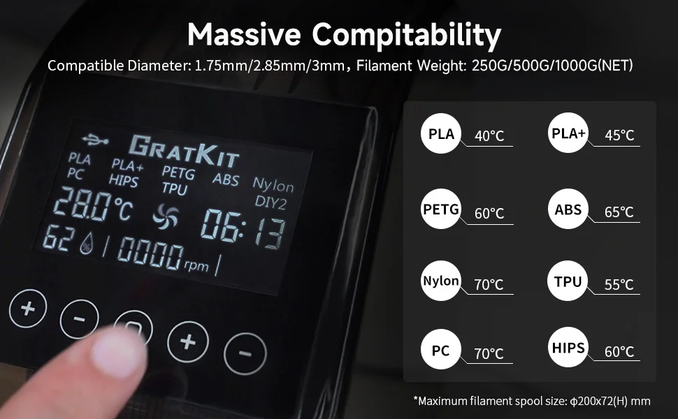 Compatible with Nylon/PC/PETG filament. In particular, nylon materials are easily affected by moisture in the air. After the drying box reaches 70°C, it can be removed more easily, reducing the impact of moisture on the filament.