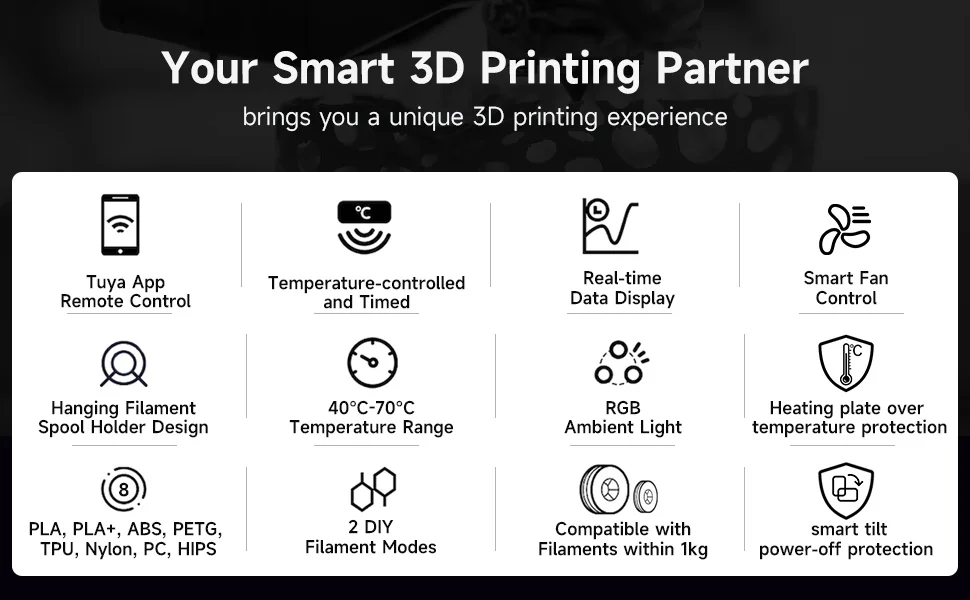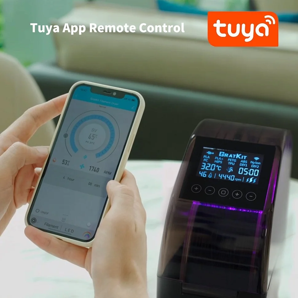 Smart app control, the Tuya app support Up to 200+ countries/regions. Release your hand. Remote control it, check status, dry the filament at anytime and anywhere.