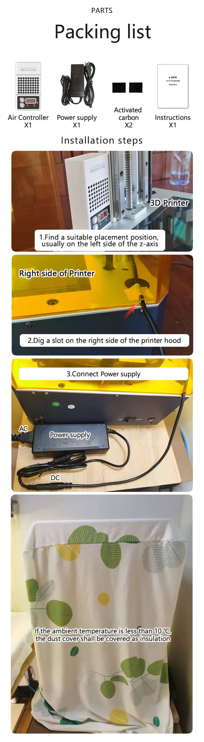 【Function】3D printer air controller contains three functions, one is heating, one is Air circulation, and the other is filtering. When the temperature is lower than the set temperature, start heating; when the temperature reaches the set temperature, start fan circulation. Built in a small activated carbon filters, which can filter odor.
