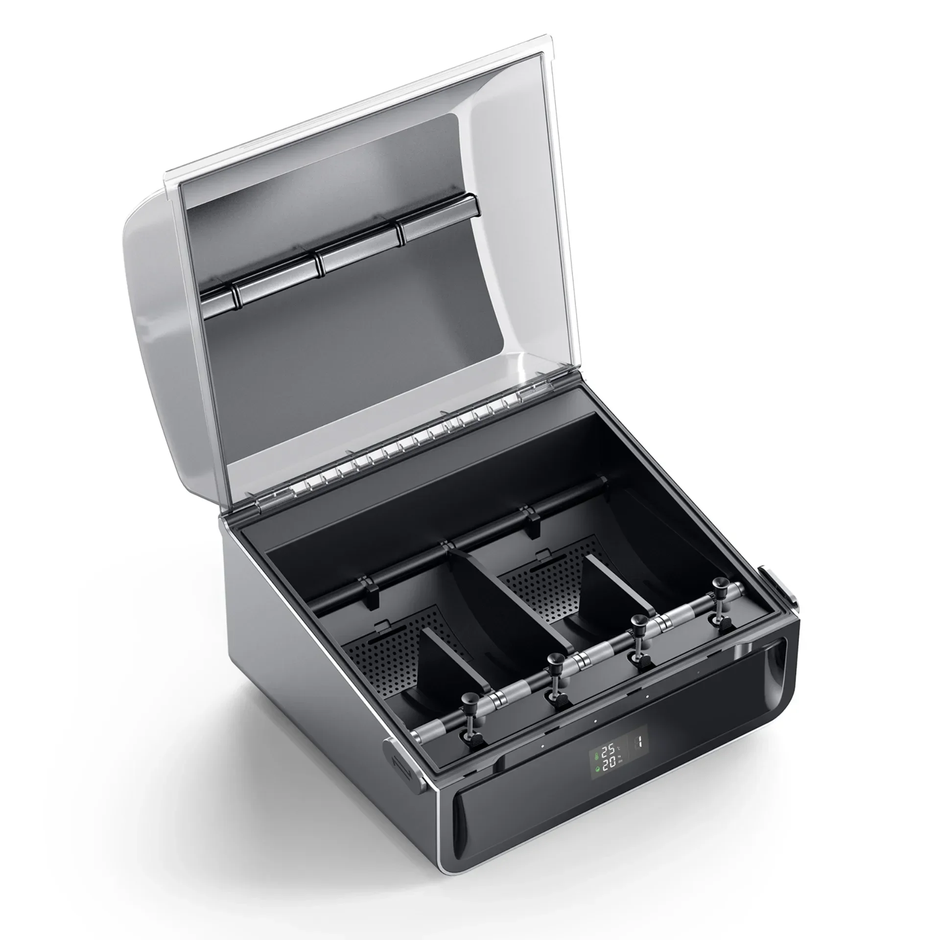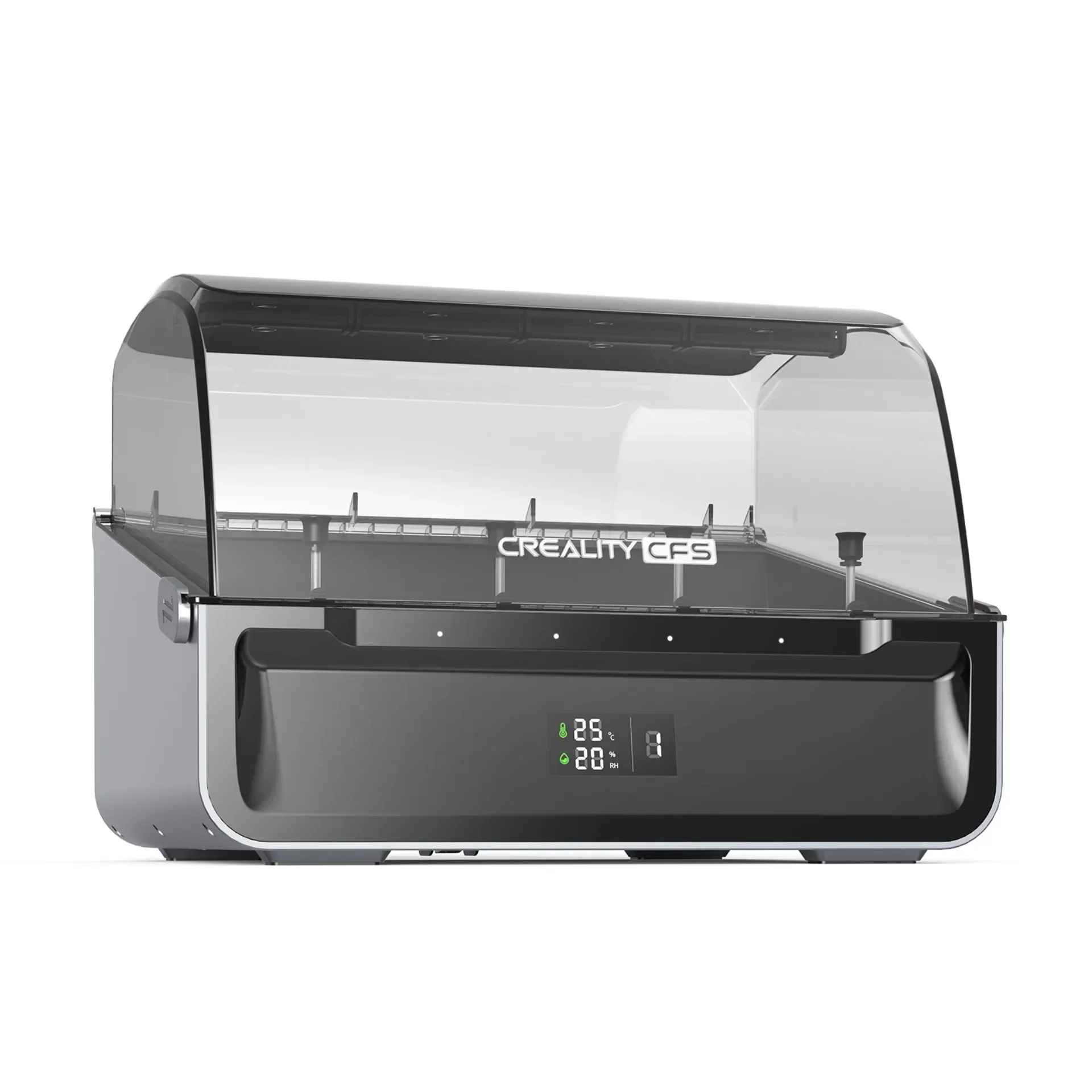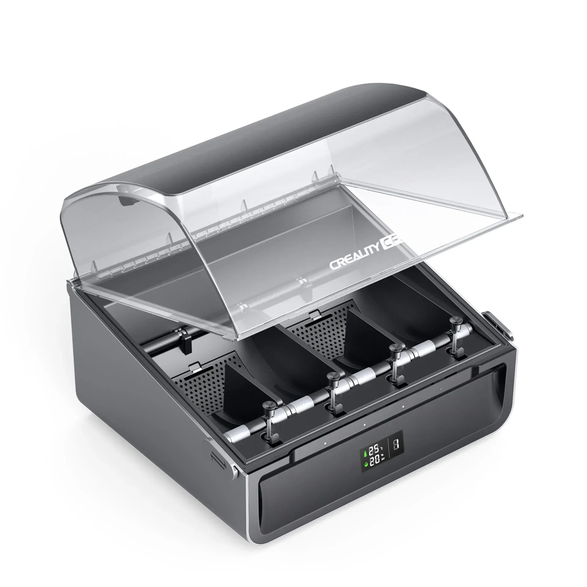 The airtight design keeps the filaments dry.A display screen indicates the inner temperatureand humidity