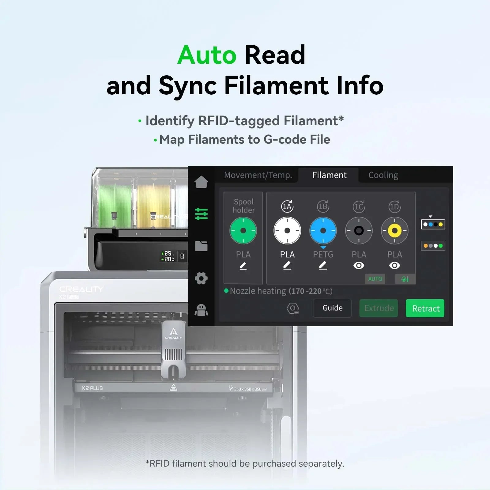 Compatible Filaments: PLA/ABS/PETG/ASA/PET/PA-CF/PLA-CF; not compatible with damp filaments;