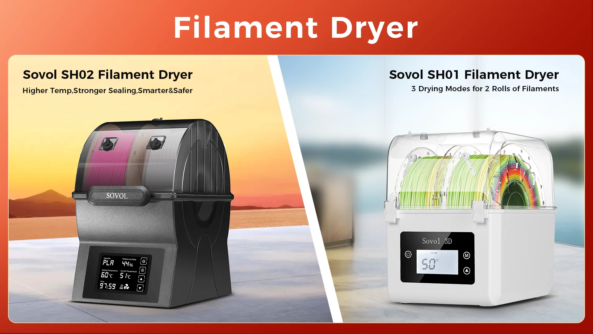 [150W PTC Fast Heater]- Different from Sovol SH01, SH02 comes with 150W PTC heater which can heat up faster and are more energy-efficient. SH02 dryer box can reach 50°C within 7 mins and reach 70°C within 25 mins. Also you can set 40-70°C as you wish. The dryer quickly heats with a built-in fan, circulating hot air 360° for uniform heating, effectively drying moisture filaments and improving your 3D printing results.