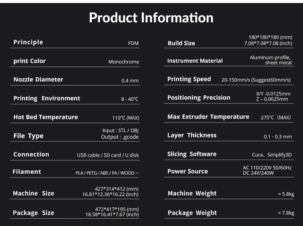 BuildSize: 180*180*180mm(7.08*7.08*7.08 inch)