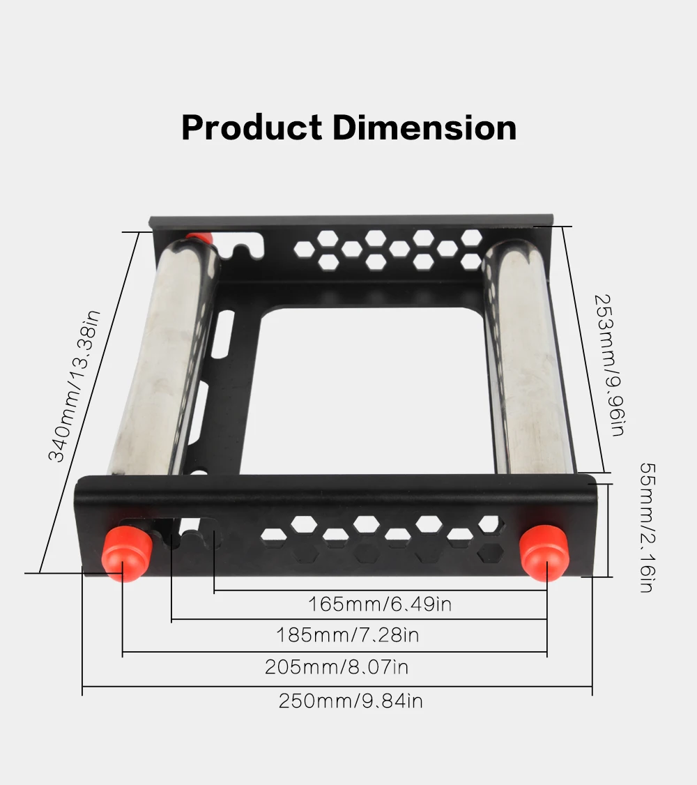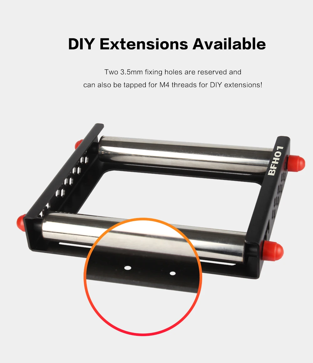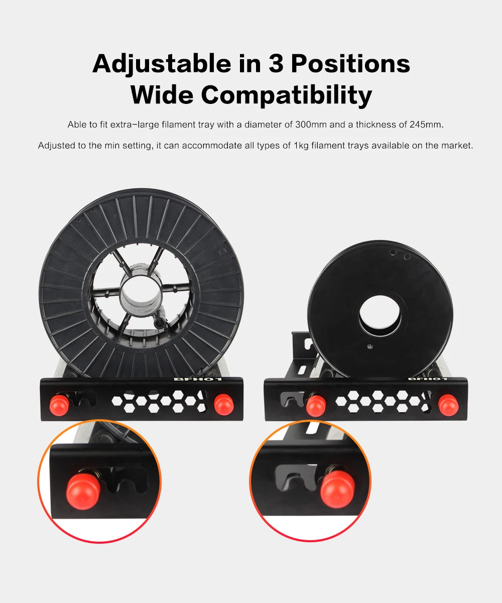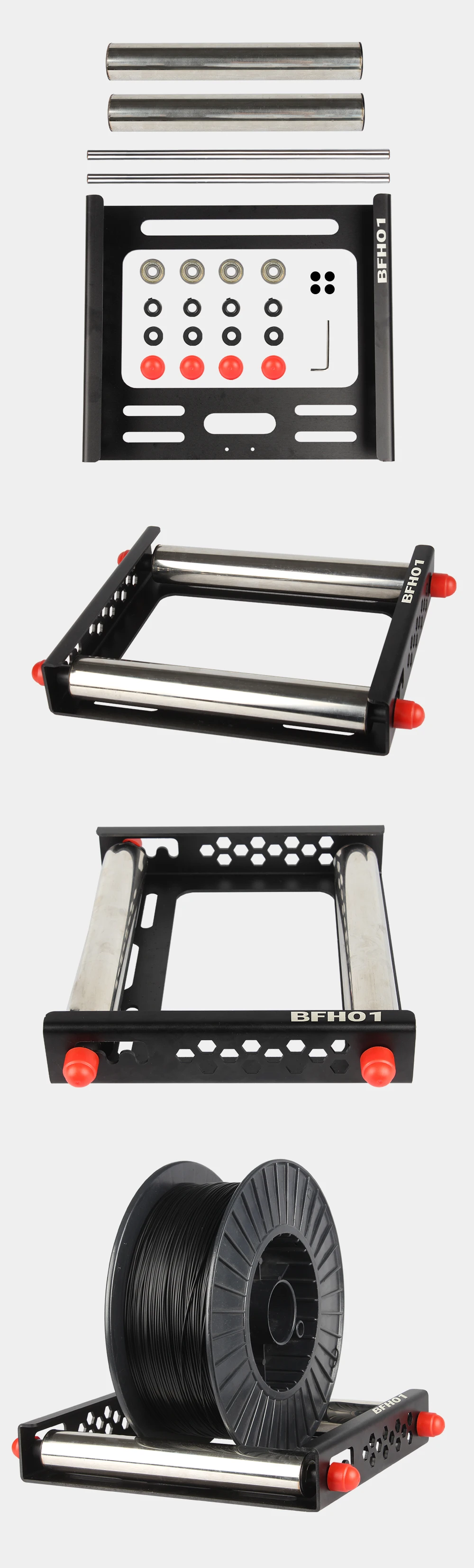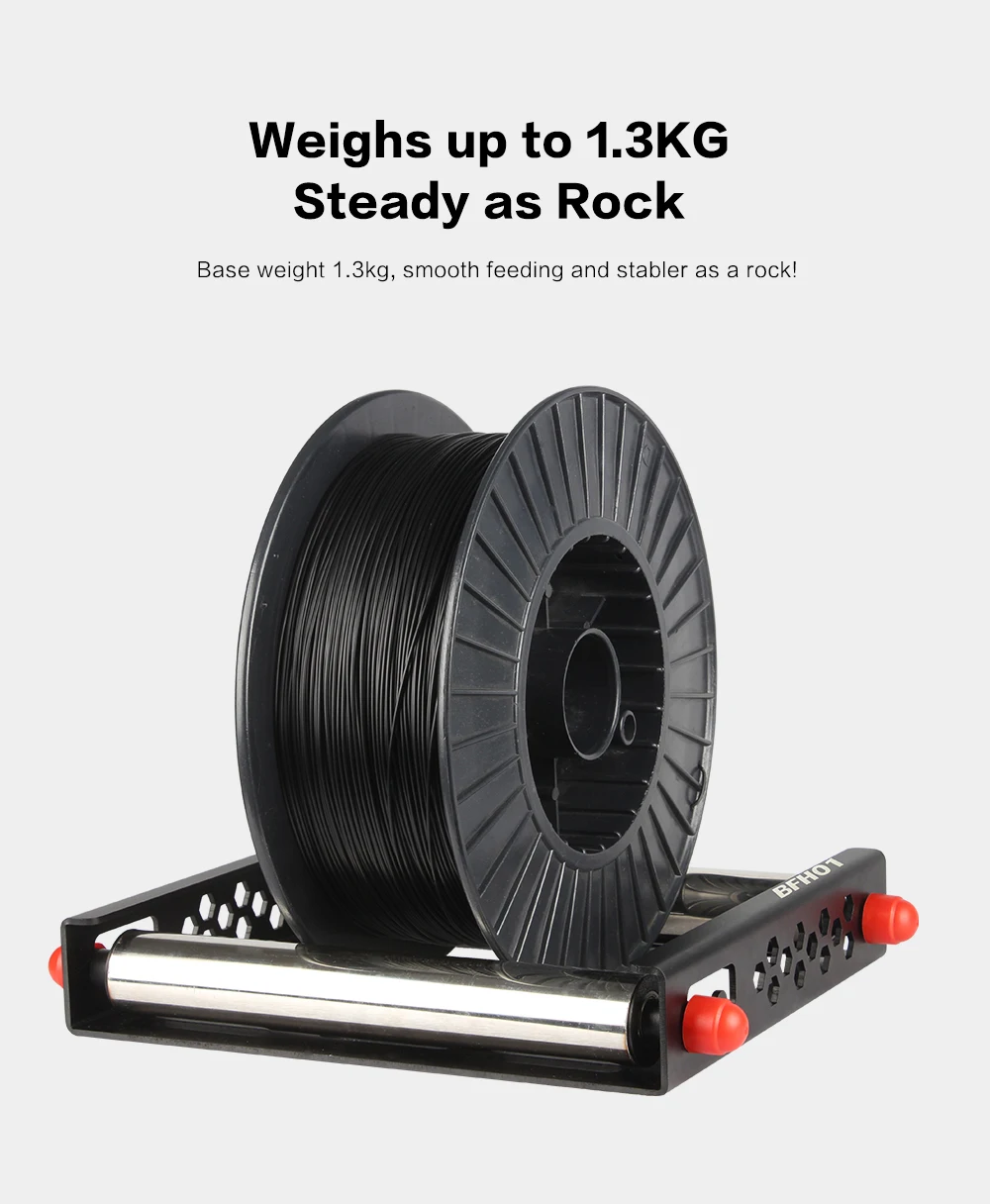 The material holder BFH01 is really good for large rolls of consumables! Other commercially available holders are usually only 100g to 200g and are likely to be dragged around when feeding material. But the BFH01 stock holder itself weighs 1.3kg and is all metal. The frame is folded from a 3mm thick aluminium alloy plate, which is hollowed out in several places for aesthetic reasons and to reduce transport costs, otherwise the weight of the frame would be 3.2kg. Roller on the bracket with a diameter of 38mm stainless steel tube, the internal rolling axis using drive bearings and 8mm diameter metal shaft auxiliary, feeding smoother. Only the cost of metal materials have reached 14usd. In addition, the product frame is sandblasted and oxidised, beautiful and atmospheric. It is very suitable for large rolls of consumables, such as 3kg, 5kg, even 10kg are no problem at all. A few words to describe it is very stable, strong compatibility, any consumables can match the bracket.